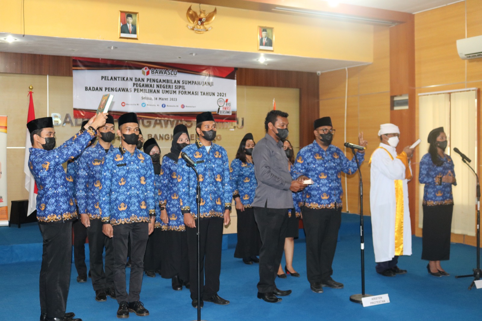 Pangkalpinang, Bawaslu Provinsi Kepulauan Bangka Belitung -- Calon Pegawai Negeri Sipil (CPNS) Bawaslu di Provinsi Kepulauan Bangka Belitung (Babel) hari ini resmi dilantik menjadi Pegawai Negeri Sipil (PNS) oleh Sekretaris Jenderal Bawaslu Ichsan Fuady, Selasa (14/03/2023).