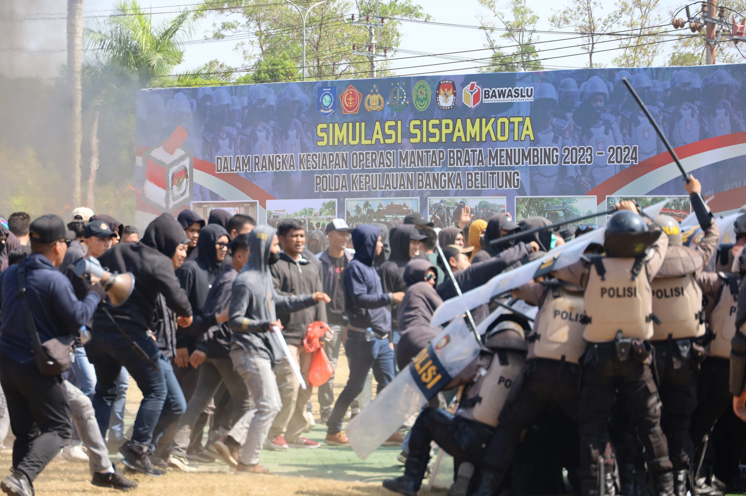 Pangkalpinang, Bawaslu Babel - Sebagai upaya menjaga kondusivitas pesta demokrasi, serta mengantisipasi agar tidak terjadinya hal-hal yang tidak dikehendaki pada perhelatan Pemilu 2024, Kepolisian Daerah (Polda) Kepulauan Bangka Belitung (Babel) sebagai leading sektor pengamanan bersama dengan pasukan gabungan dari TNI, Satpol PP dan stakeholder terkait lainnya menggelar Simulasi Sispamkota dalam rangka kesiapan Operasi Mantab Brata Menumbing 2023-2024. Kegiatan yang berlangsung di halaman Kantor Gubernur Babel pada Selasa (10/10/2023).