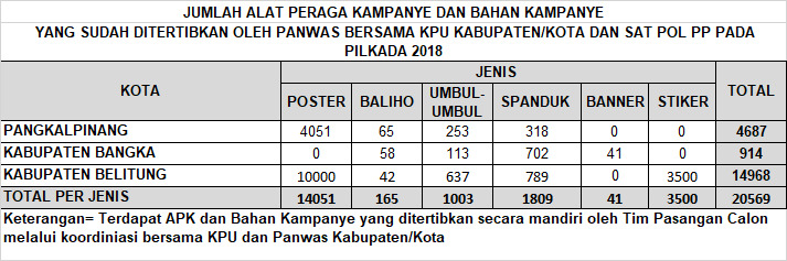Untuk Kota Pangkalpinang, Andi melanjutkan, berdasarkan jenisnya; poster, baliho, umbul-umbul, spanduk dan banner, total sebanyak 4.687 APK dan bahan kampanye. Sedangkan Kabupaten Bangka sebanyak 914. Sementara Kabupaten Belitung total sebanyak 11.468 APK dan bahan kampanye. "berdasarkan jumlah gabungan tiga kabupaten kota ini, untuk jenis poster sebanyak14.015, baliho sebanyak 165, umbul-umbul sebanyak 1.003, spanduk sebanyak 1.809, dan banner sebanyak 41 buah. Jadi total keseluruhan APK dari tiga kabupaten/kota ini sebanyak 17.069 buah, " paparnya.