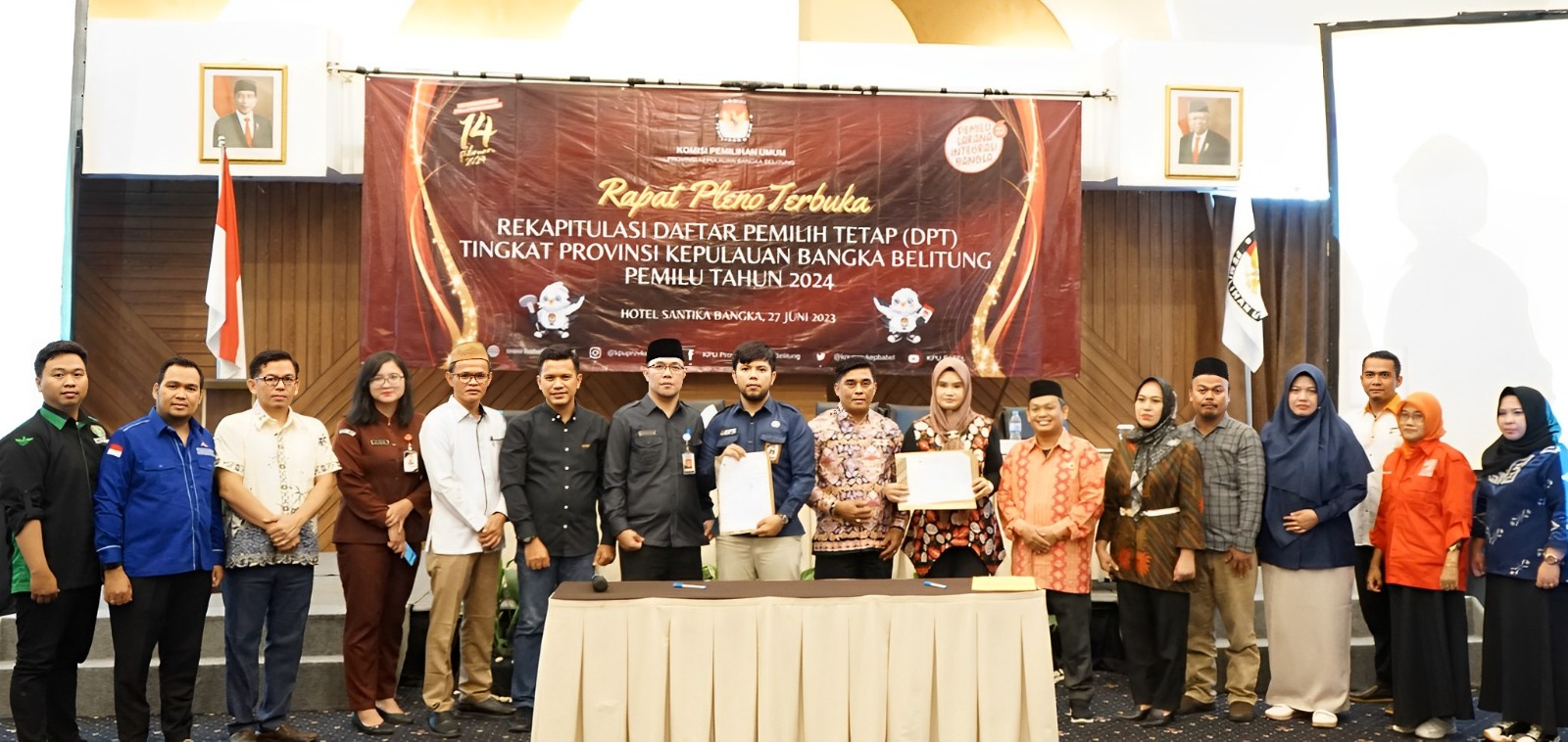 Pangkalpinang, Bawaslu Babel - Lakukan pengawasan penetapan Daftar Pemilih Tetap, Ketua dan Anggota Badan Pengawas Pemilihan Umum Provinsi Kepulauan Bangka Belitung (Bawaslu Babel) hadiri Pleno Terbuka Rekapitulasi DPT Tingkat Provinsi Kepulauan Bangka Belitung pada Pemilu Tahun 2024 yang diselenggarakan oleh Komisi Pemilihan Umum Provinsi Kepulauan Bangka Belitung (KPU Babel) di Hotel Santika Bangka, Selasa (27/06/2023).