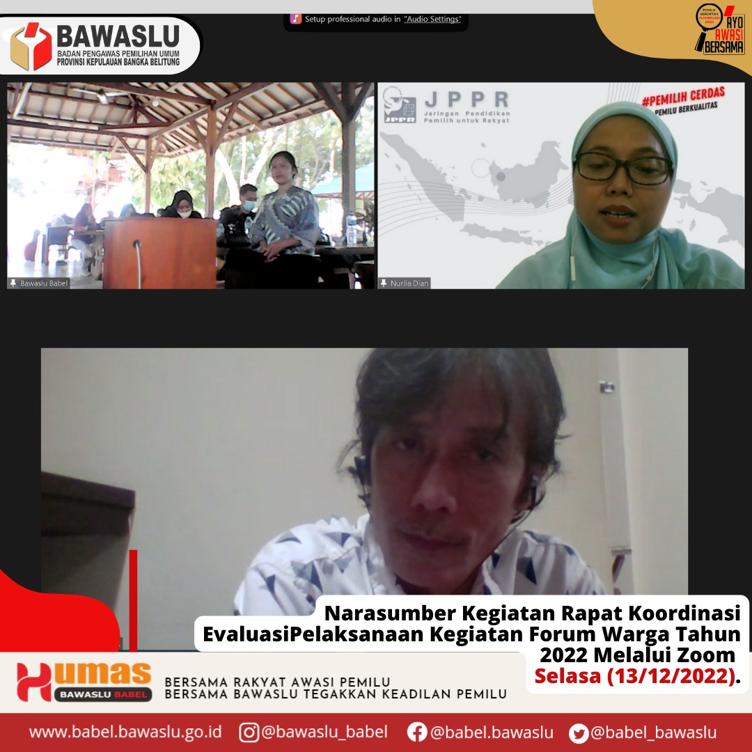 Kegiatan dihadiri oleh Anggota Bawaslu beserta Pejabat Struktural dan Staf Sekretariat Bawaslu Provinsi dan Bawaslu Kabupaten/Kota serta narasumber dari Pemerhati Pemilu dan Jaringan Pendidikan Pemilih untuk Rakyat (JPPR), di Tanjungpandan, Selasa (13/12/22).