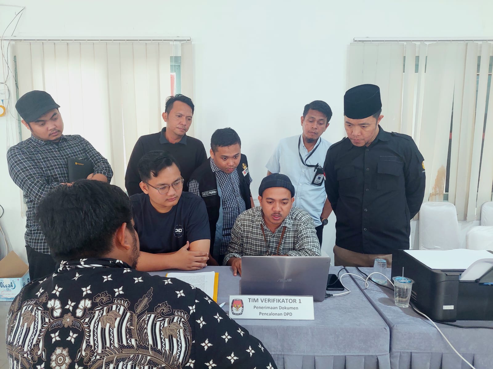 Ketua Bawaslu Babel beserta staf sekretariat melakukan pengawasan dengan seksama terhadap pendaftaran kedua bakal calon DPD atas nama Dwi Hartono dan Justiar Noer di Kantor KPU Provinsi Bangka Belitung, Pangkalpinang, Sabtu (06/05/2023).