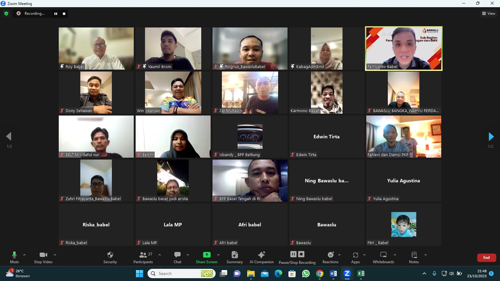 Pangkalpinang, Bawaslu Babel – Sekretariat Bawaslu Provinsi Kepulauan Bangka Belitung (Babel) menyelenggarakan Rapat Pembahasan Anggaran Belanja Tambahan dan Persiapan Pelaksanaan Program/Kegiatan Akhir Tahun Anggaran 2023 Tahap II secara virtual, Senin (23/10/2023).