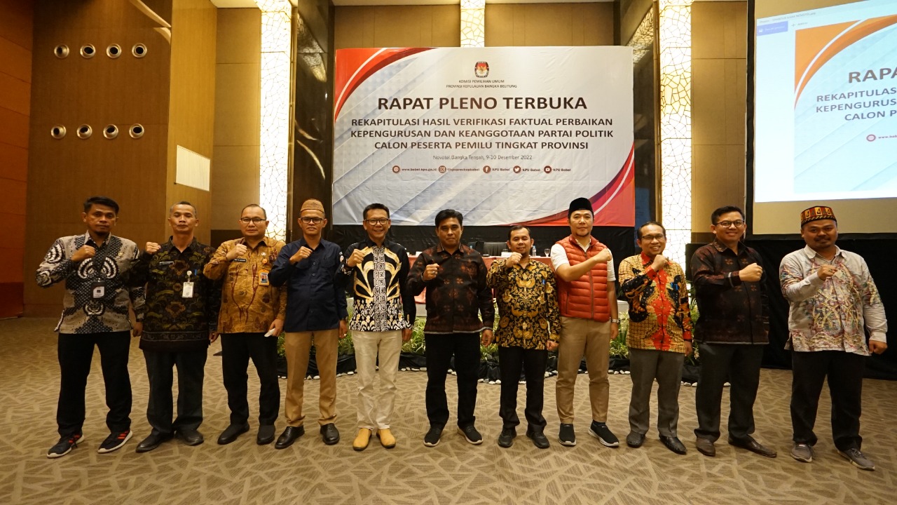 Bangka Tengah, Babel.Bawaslu.go.id -- Bawaslu Provinsi Kepulauan Bangka Belitung (Babel) mengahdiri Rapat Pleno Terbuka Rekapitulasi Hasil Verifikasi Faktual Perbaikan Kepengurusan dan Keanggotaan Partai Politik Calon Peserta Pemilu Tingkat Provinsi di Novotel, Kabupaten Bangka Tengah, Jumat (09/12/2022)