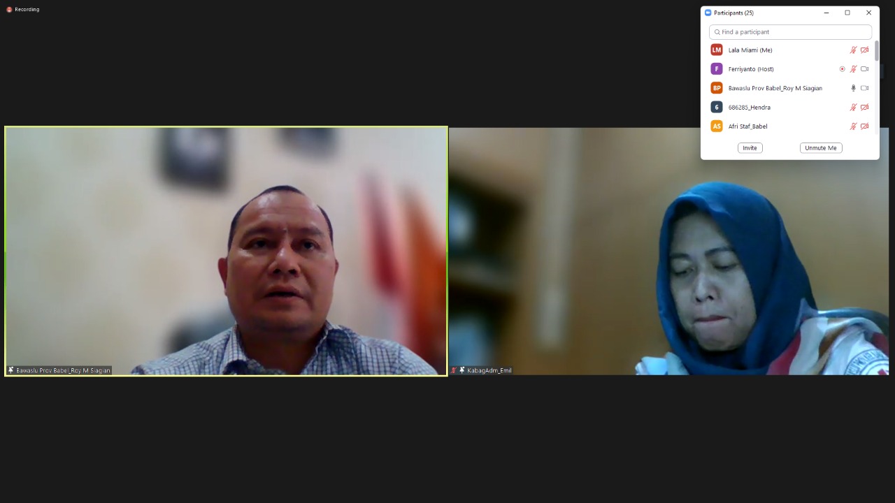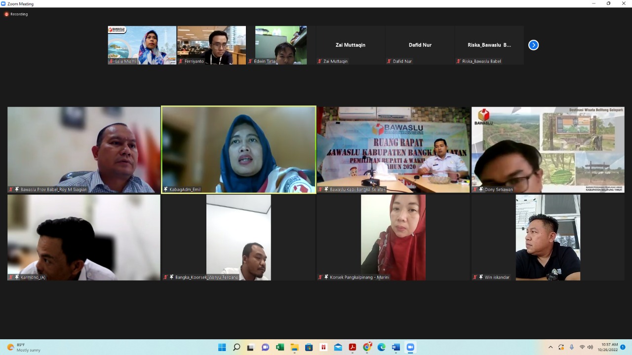 Pangkalpinang, Babel.Bawaslu.go.id - Badan Pengawas Pemilihan Umum (Bawaslu) Provinsi Kepulauan Bangka Belitung (Babel) menyelenggarakan Rapat Pembahasan Langkah-Langkah Akhir Tahun Anggaran 2022 bersama Bawaslu kabupaten/kota se-Babel pada Rabu (26/10/2022) secara virtual.