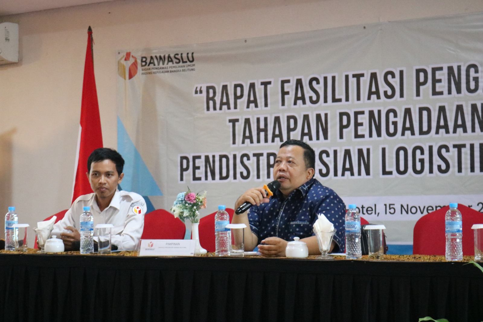 Pangkalpinang, Bawaslu Babel -- Bawaslu Provinsi Kepulauan Bangka Belitung (Babel) Gelar Rapat Fasilitasi Pengawasan Tahapan Pengadaan dan Pendistribusian Logistik Pemilu Tahun 2024, menghadirkan dua orang narasumber, Anggota KPU Provinsi Kepulauan Bangka Belitung , Deni dan Akademisi IAIN SAS Babel Dr. H. Iskandar, M.Hum. di Grand Safran Pangkalpinang. Rabu, (15/11/2023).