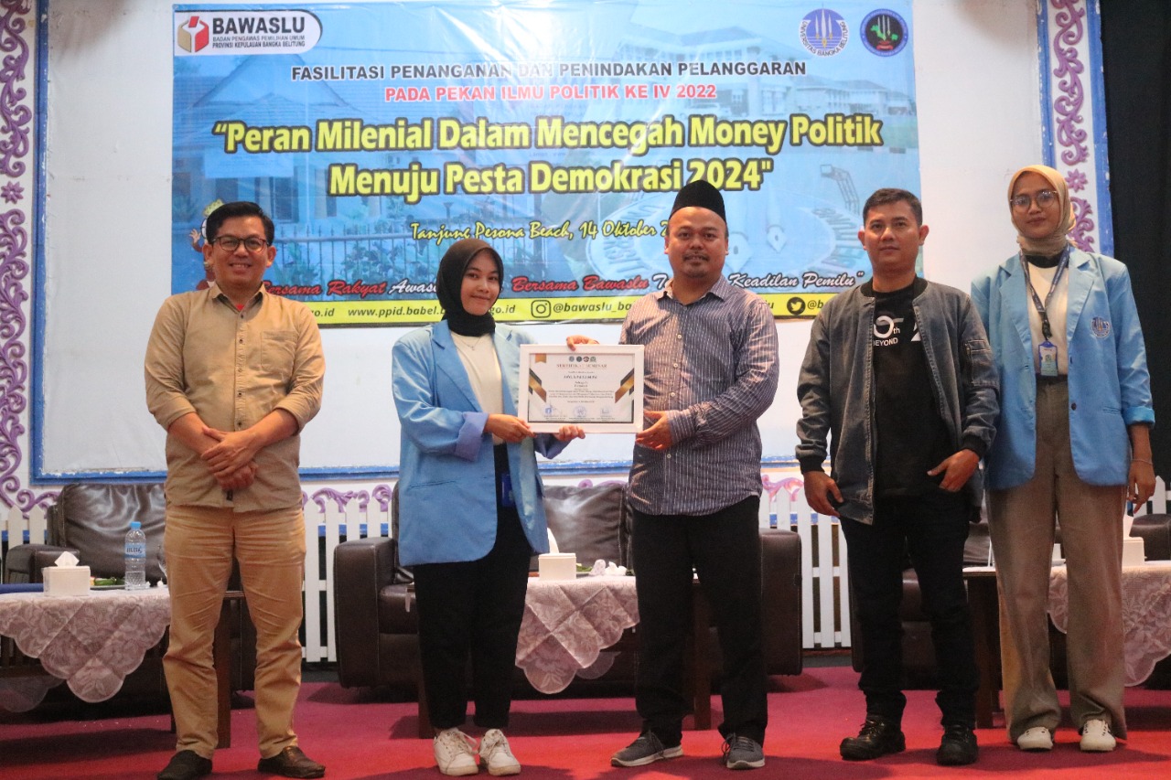 Sungailiat, Babel.Bawaslu.go.id -- Badan Pengawas Pemilihan Umum Provinsi Kepulauan Bangka Belitung (Bawaslu Babel) bekerja sama dengan Himpunan Mahasiswa Ilmu Politik (Himapol) FISIP UBB menggelar Seminar bertajuk "Peran Milenial dalam Mencegah Money Politic Menuju Pesta Demokrasi 2024" yang berlangsung di Ballroom Tanjung Pesona Hotel, Sungailiat, Bangka, Jumat (14/10/2022).