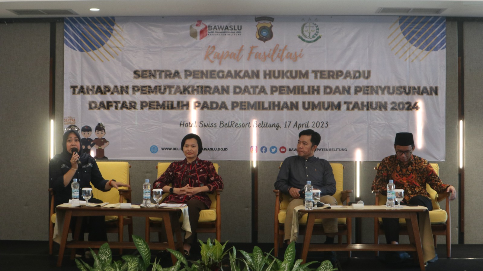 Sijuk, Bawaslu Provinsi Kepulauan Bangka Belitung - Badan Pengawas Pemilihan Umum Kabupaten Belitung menggelar Rapat Sentra Penegakan Hukum Terpadu Tahapan Pemutakhiran (Gakkumdu) Data Pemilih Dan Penyusunan Daftar Pemilih Pada Pemilihan Umum Tahun 2024 di Hotel Swis BelResort Belitung, Senin (17/4/2023).