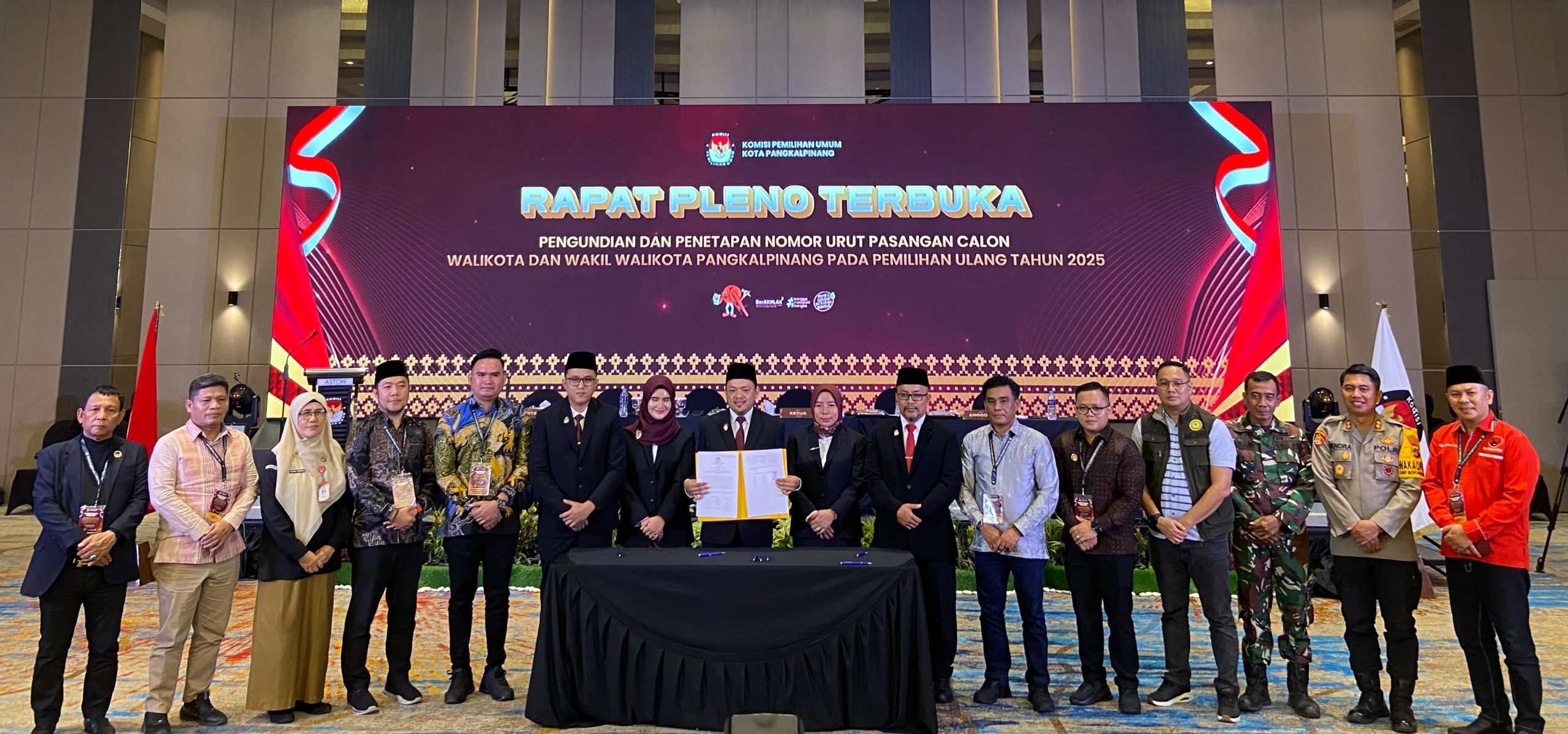 KPU Kota Pangkalpinang secara resmi menetapkan nomor urut bagi empat pasangan calon yang akan berkontestasi dalam Pilkada Ulang 2025. Berdasarkan Keputusan KPU Kota Pangkalpinang Nomor 106 Tahun 2025 tanggal 23 Juli 2025, penetapan nomor urut pasangan calon adalah sebagai berikut:
