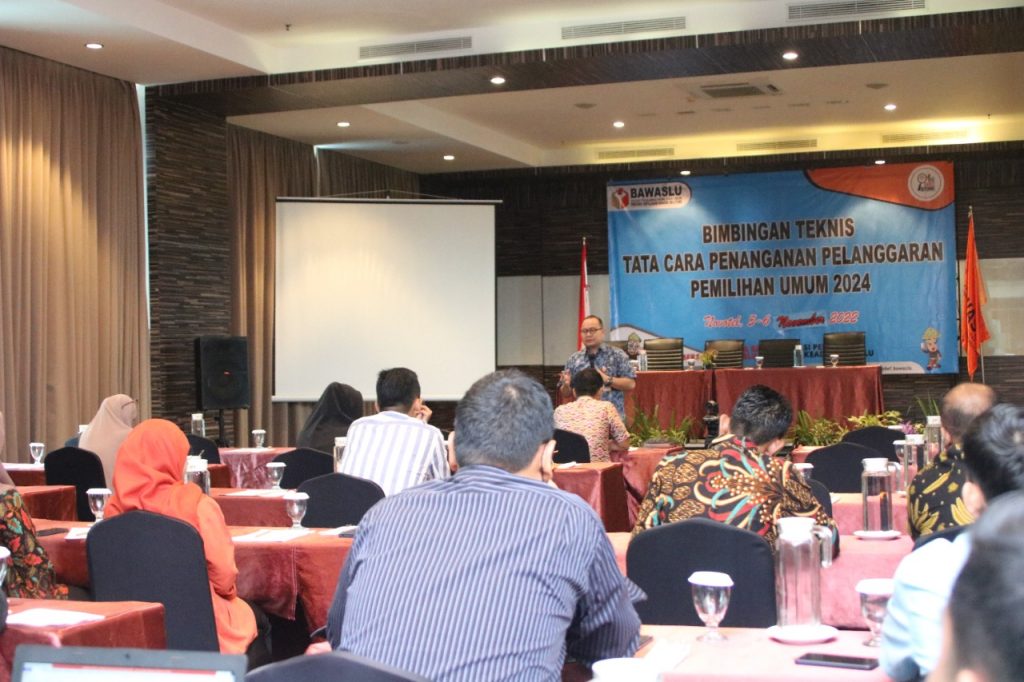 Hadir sebagai narasumber dalam kegiatan Bimbingan Teknis Tata Cara Penanganan Pelanggaran Pemilihan Umum Tahun 2024, Minggu (06/11/2022). Kepala Sekretariat Bawaslu Provinsi Kepulauan Bangka Belitung (Babel) Roy M Siagian, menyampaikan peranan penting kesekretariatan dalam upaya memfasilitasi komisioner bawaslu kabupaten kota dalam melakukan penanganan pelanggaran.
