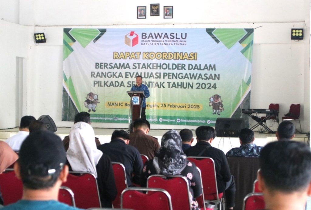 Bangka Tengah, Bawaslu Babel – Plt Kepala Sekretariat Bawaslu Provinsi Kepulauan Bangka Belitung, Yaumil Ikrom, menghadiri Rapat Koordinasi dengan stakeholder dalam rangka Evaluasi Pengawasan Pemilihan Kepala Daerah Tahun 2024 di Kabupaten Bangka Tengah, yang berlangsung di MAN Insan Cendekia Bangka Tengah, Desa Sungkap, Kecamatan Simpang Katis, Kabupaten Bangka Tengah, Selasa (25/02/2025).